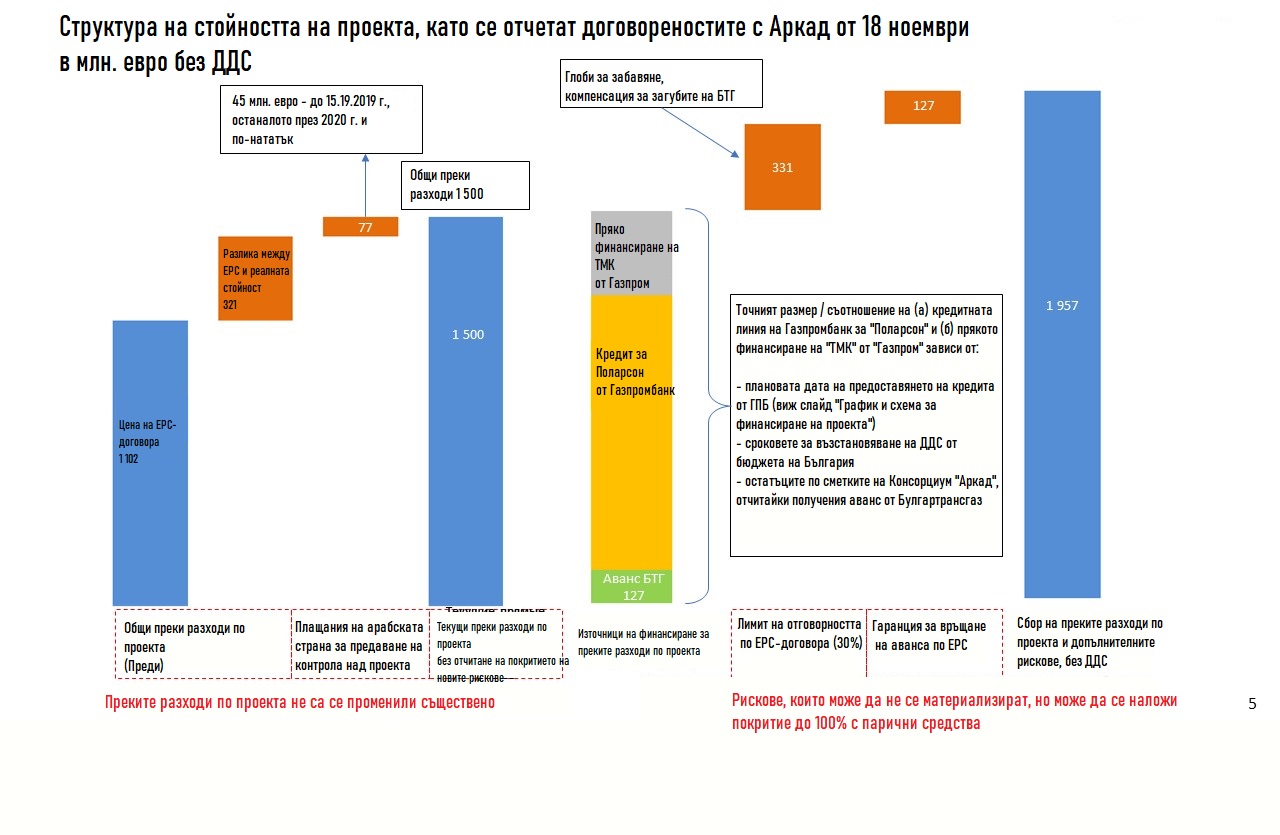 Руснаците разказват и по какъв начин цената на разноските по плана може да скочи съвсем двойно поради евентуалните опасности - да вземем за пример преустановяване на контракта поради съществено закъснение, което ще докара до задължаване за връщане на задатъка и санкция от 30% от цената му (над 300 млн. евро).