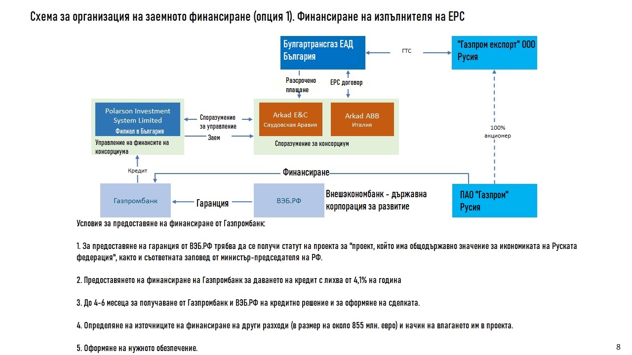 В документа са разиграни и две схеми за финансирането. Опция 1 допуска парите да се обезпечат като държавно-гарантиран (от Русия) заем за " филиал в България на " Поларсон ".