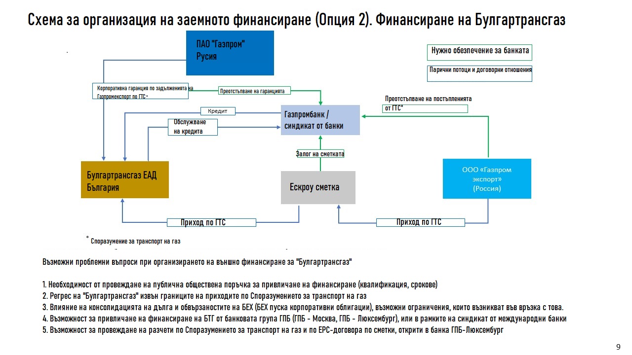 Опция 2 е " Газпромбанк " или " профсъюз от интернационалните банки " да даде заем на българската " Булгартрансгаз ", а тя да го обслужва с приходите си от превозването на газ.