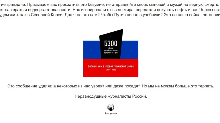 " Скъпи жители, призоваваме ви да не изпращате синовете и съпрузите си на сигурна гибел. Путин ни принуждава да лъжем и ни заплашва. Изолираха ни от целия свят, стопираха да купуват петрол и газ. След няколко години ще живеем като в Северна Корея. За какво ни е нужно това? За да попадне Путин в учебниците? Това не е наша война, негова е. ", гласи известие на основната страница.