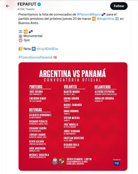 Селекционерът на Панама Томас Кристенсен извика 20 футболисти за дуела с „ гаучосите “, който ще е първи за тях след извоюваната международна купа. 14 от тях играят в локалното състезание, а останалите 6 – в задгранични клубове. Избраниците на селекционера стартират подготовка на 19 март. Групата ще пътува за аржентинската столица Буенос Айрес на 21 март. Двубоят ще се играе на най-големия стадион в Южна Америка – „ Ел Монументал “ на “Ривър Плейт ”.