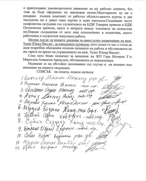 Ето и цялостният текст на сигнала на работещите на гарата в Исперих: