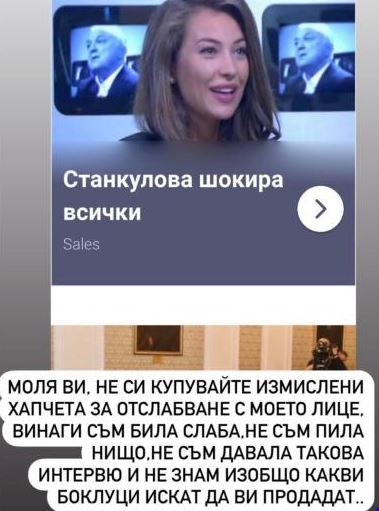 Станкулова разгласява и изявление с нея, което тя самата споделя, че в никакъв случай не е давала по тематиката. Продуктът за намаляване съдържа бета-хидроксимаслена киселина, употребява катотерапи при Паркинсон и Алцхаймер. Според осведомени сходни артикули са доста рискови за здравето и положителното физическо положение на организма. Това не е първата корист с лицето на хубавицата. Още преди години друга компания още веднъж се опита да популяризира сходна отслабваща добавка с лицето на хубавицата. Въпреки всичките си предизвестия въпреки всичко измамници не престават да натрупат пари на база на подправения си артикул, осведоми novini.bg.