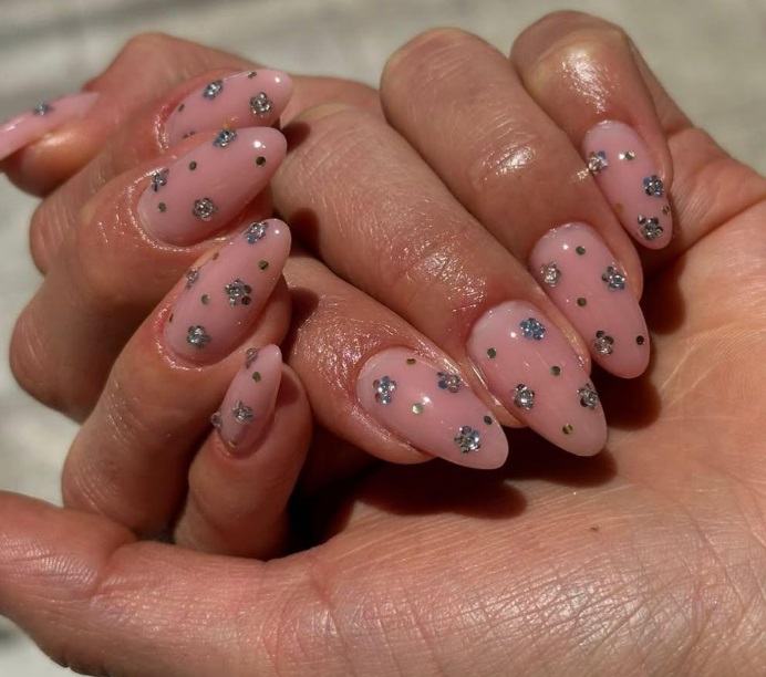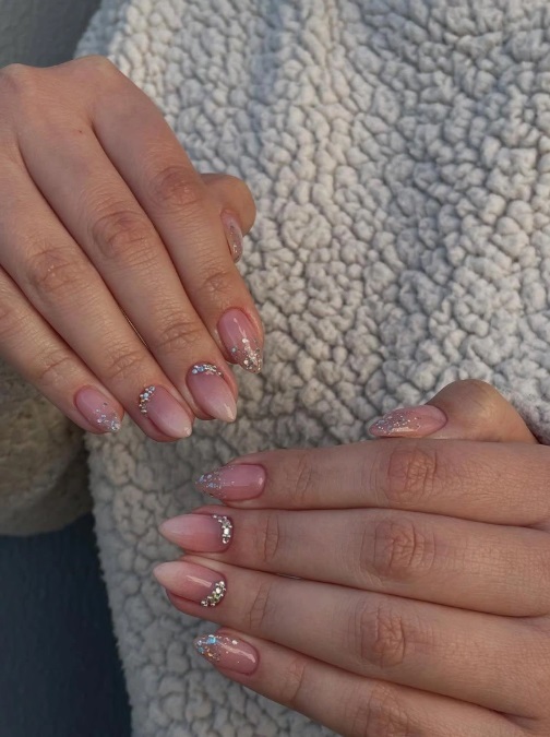 Много грациозен и хубав дизайн! За да го извършите, главното нещо, от което се нуждаете, са кристалите. Нанесете на ноктите нюд колорит и по-късно подредете декора, както желаете. Можете да го извършите безредно или като цветя от брокат. Нанесете транспарантен лак върху кристалите, тъй че да се фиксират, и сте подготвени.