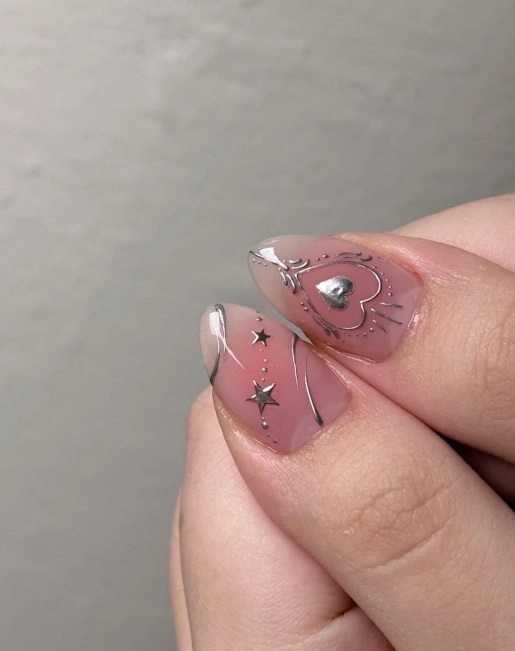 Ако постоянно избирате сребро пред злато, този дизайн също ще ви хареса. Можете да експериментирате и да употребявате сребърен лак за нокти, с цел да нарисувате сърца, звезди или просто спретнати линии. Важно е рисунките да са тънки и елегантни, с цел да не се загуби минималистичният резултат.