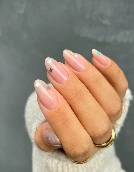 Този маникюр не изисква доста старания. Лакирайте ноктите си в безпристрастен колорит и по-късно прибавете стикери със звезди. Можете да ги подредите както пожелаете. Не забравяйте да ги запечатате с транспарантен лак, с цел да издържи маникюрът ви по-дълго.