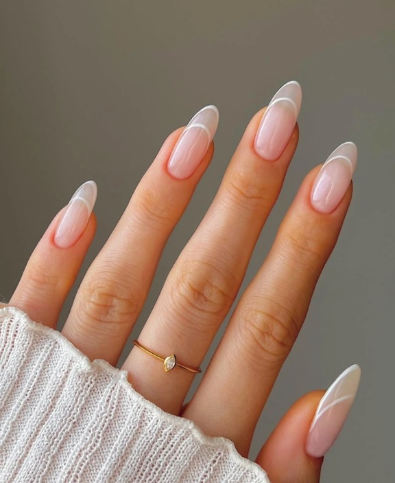 Този френски маникюр е малко по-различен от класическия, което го прави по-интересен. Нанесете млечна основа върху ноктите си, а по-късно с тънка четка и бял лак очертайте линията на усмивката. Ще получите френски маникюр във формата на елегантна рамка.