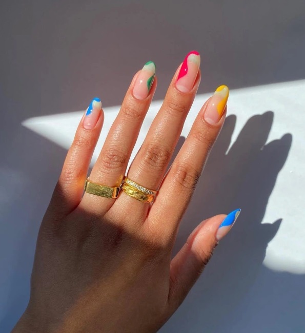 Изберете няколко от обичаните си ярки лака и нарисувайте разнородни нереални шарки върху телесна основа. Различните цветове наподобяват изключително впечатляващо на безпристрастен декор. По този метод можете да създадете доста настоящ дизайн бързо и елементарно.