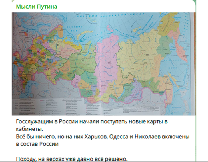 Русия очерта контурите на бъдещите съглашения за Украйна. Така на новата карта, публикувана във всички обществени мрежи, Харковска, Одеска и Николаевска области са включени в Русия дружно със Запорожка и Херсонска области, както и ЛНР и ДНР.