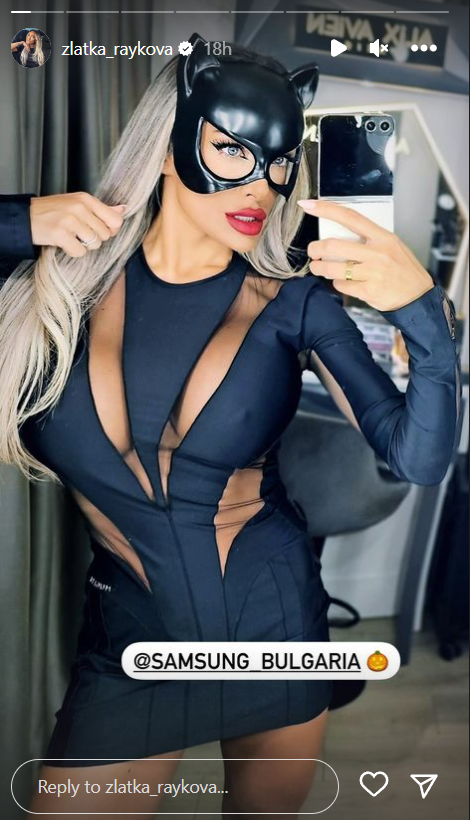 Златка Райкова за следващ път заложи на бюста си, който обилно сподели в дребна черна рокля. Блондинката бе поставила и маска на котка, която е от веригата „ Джъмбо ” и коства 6 лв., сподели инспекция на „ Уикенд ”.