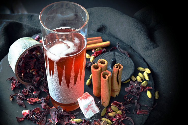Хибискусът е прочут под разнообразни имена, само че най-често срещани са китайска роза и каркаде. Дървовидното храстче е с нежни, рубинени цветове, които имат необятно приложение в кулинарията - венчелистчетата се влагат във виновност и сосове, свежите цветове красят салати и сладкарски шедьоври, а най-широко разпространяване има чаят от изсушените цветове.Ето една концепция за сироп с огнен цвят, богат мирис и извънредно освежителен резултат - сироп от хибискус, кардамон, канела, небет шекер или захар, който може да се сервира като шербет, леден чай или лимонада. Използвах 1 литър вода, 5 с. лъжици хибискус, шепа кардамонови шушулки, леко счукани, 2 пръчки канела, 500 г небет шекер или захар. Как го направих: Разделих водата на две елементи: от едната направих сироп, а с другата запарих* хибискуса. За сиропа: В тенджера смесих вода и захар, сложих на котлона, освавих да заври и прибавих кардамон и канела. Разбърквах, до момента в който захарта се разтвори, изключих котлона, сложих похлупак и оставих за 2 часа. Хибискусът запарих с вряща вода за към 10 минути. Прецедих двете течности, смесих ги, налях в бутилка и охладих. Сервирах с газирана вода и лед.*За да се извлече максимумът от позитивните качества на хибискуса (високо съдържаниие на витамин С, аминокиселини) той не трябва да се вари, а единствено да се запари.