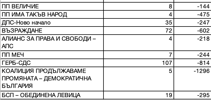 Според разбора всички обединения в 51-вото Народно заседание, както и “Величие ”, имат и дописани, и отписани гласове. Най-много неотчетени гласове има за ППДБ, следвани от ГЕРБ-СДС, Има Такъв Народ и “Възраждане ”, а най-вече добавени - за ГЕРБ-СДС, “Възраждане ” и “ДПС-Ново начало ”.
