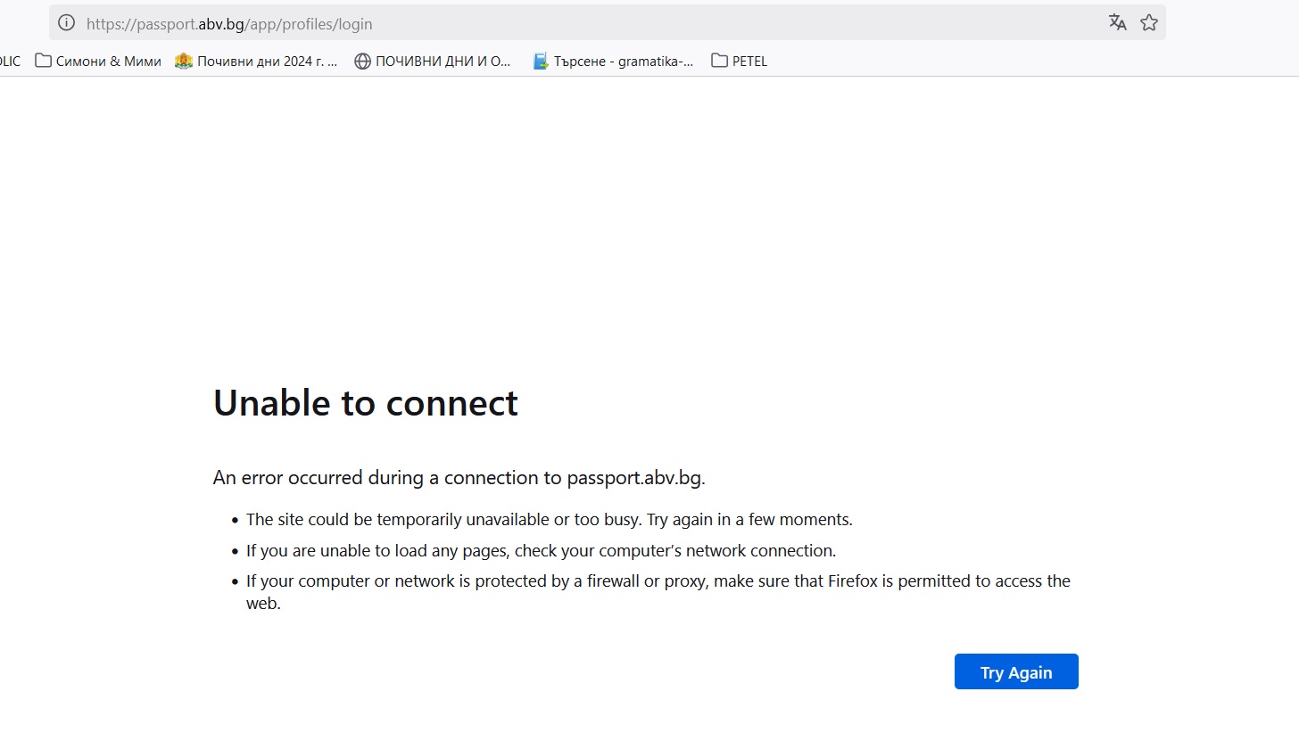 страницата може да е краткотрайно недостъпна или прекомерно натоваренаако нямате опция да заредите никакви други страници, проверете връзката на компютъра си с мрежатаако вашият компютър или мрежа са със мощна отбрана, апелирам уверете се, че браузърът ви има достъп до интеренет.