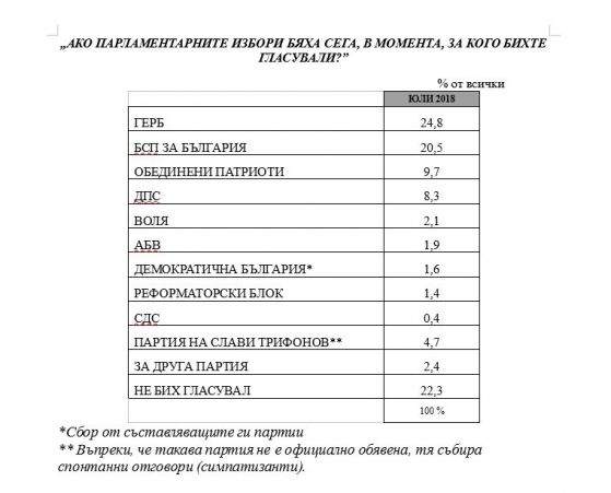 Ако изборите бяха през днешния ден, ГЕРБ още веднъж щяха да са първа политическа мощ с 24.8% от вота на популацията. Българска социалистическа партия остават на второ място с 20.5%, а Оперативна програма - на трето с 9.7%. При избор в този момент Движение за права и свободи биха събрали 8.3%, " Воля " - 2.1%, АБВ - 1.9%, " Демократична България " - 1.6%, Реформаторски блок - 1.4%, Съюз на демократичните сили - 0.4%.