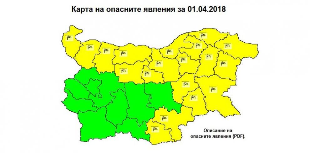 Жълт код поради предстоящ мощен вятър е разгласен в 19 области на страната за 1 април - неделя . Предупреждението е в действие за областите Видин, Монтана, Враца, Плевен, Ловеч, Габрово, Велико Търново, Русе, Търговище, Разград, Силистра, Добрич, Варна, Шумен, Бургас, Сливен, Ямбол, Хасково и Кърджали.