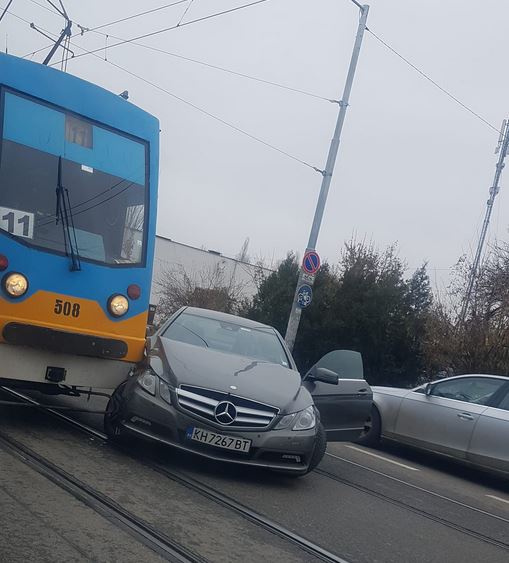 На споделени фрагменти виждаме трамвай и " Мерцедес ", които са се блъснали.