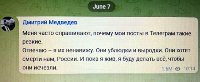 „ Хората постоянно ме питат за какво постовете ми в Telegram са толкоз остри. Отговорът е, че ги ненавиждам. Те са копелета и изроди. Те желаят нашата гибел, на Русия. И до момента в който съм жив, ще върша всичко допустимо те да изчезнат “. Това написа заместник-председателят на съветския Съвет за сигурност Дмитрий Медведев в канала си в Telegram, без да посочи кого тъкмо има поради, оповестява BBC.