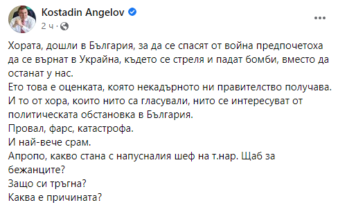 Хората, пристигнали в България, с цел да се спасят от война избраха да се върнат в Украйна, където се стреля и падат бомби, вместо да останат у нас. Ето това е оценката, която некадърното ни държавно управление получава. Това написа някогашният здравен министър и сегашен народен представител от ГЕРБ проф. Костадин Ангелов във Facebook.