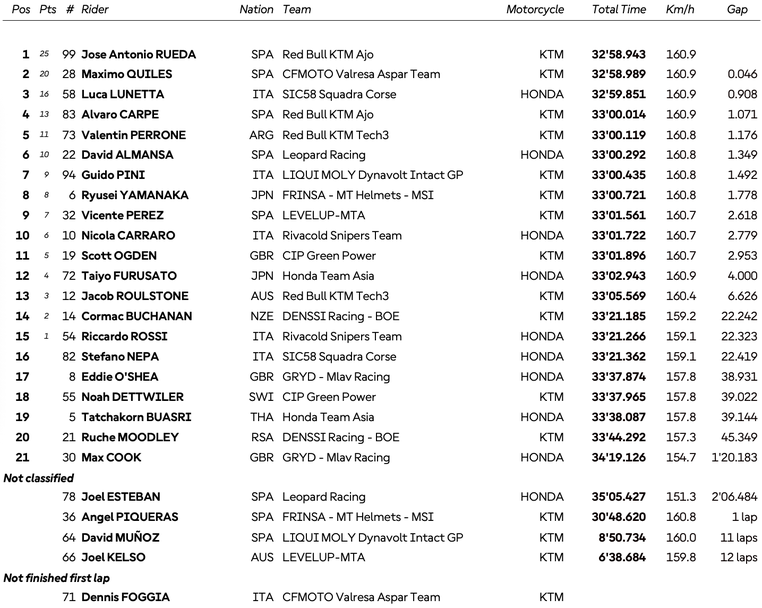 В генералното класиране в Moto3 водач след първите седем кръга за сезона с актив от 141 точки е Руеда,чийто задатък на върха е повече от две победи. Втори с закъснение от 54 пункта е Анхел Пикерас, който през днешния ден не взе точки, откакто не взе точки след удар от страна на Фурусато в самия край. Заради него японецът беше осъден с три секунди след финала.