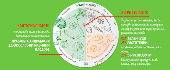 Методът на Veggie Plate/Зелено плато е тъкмо такава идея, която е подобаваща и за месоядци, и за всеядни, и за предпочитащи растителна храна. Временното ограничение на потреблението на месо се отразява позитивно на организма. Препоръчително е да се следва правилото 3 от 7 дни да се употребяват растителни храни, само че спазвайки салдото – 50% зеленчуци, 25% растителни протеини и 25% въглехидрати.