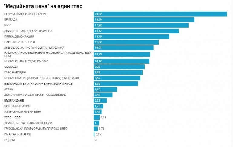 Сравнението сред средствата, отделени за медийни услуги, и получените гласове демонстрира, че най-объркани са били сметките в партията на Цветан Цветанов - Републиканци за България. Впечатление прави, че групировката е отделила 206 984 лева за реклама, само че привлечените от нея гласове са едвам 8 546. Така „ медийната цена ” на един глас за тази партия възлиза на 24.22 лева Неуспешна се оказа тактиката и на Българските патриоти - Вътрешна македонска революционна организация, Воля и НФСБ. Коалицията влага 690 970 лева, с цел да доближи до своите симпатизанти, а получи доверието на 85 795 от тях. Сред парламентарно показаните партии най-скъп е бил гласът за Демократична България, който е възлизал на 3.42 лева Движение за права и свободи пък са съумели да завоюват своите симпатизанти на цена от 1 лева на глас. Сред всички участници най-ефективна е била медийната акция на ИТН - 16 ст. на глас са били задоволителни, с цел да завоюват поддръжката на гласоподавателите си. Тук би трябвало да прибавим, че партията залагаше главно на своята телевизия като канал за разпространяване на послания до своите поддръжници.