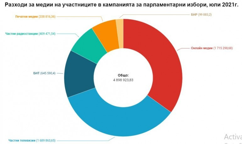 Финансовите документи демонстрират, че от обединението Демократична България са показали най-големи разноски в предизборния месец - 1 611 510 лева Следват ги Българска социалистическа партия за България с 1 159 512 лева и Българските патриоти с 906 377 лева Подробният разбор на разноските за медии демонстрира, че онлайн изданията и частните малките екрани са привлекли огромната част от средствата за отразяване в акцията. Сайтовете са били най-предпочитани за политическа реклама в предизборната конкуренция като към тях са ориентирани 35% или 1 715 299 лева За частни малките екрани пък са отделени - 34,5% или 1 689 864 лева Вероятно отчитането на огромни суми за онлайн послания се дължи и на покачвания интерес към реклама в обществените медии, който наблюдавахме в последните акции.