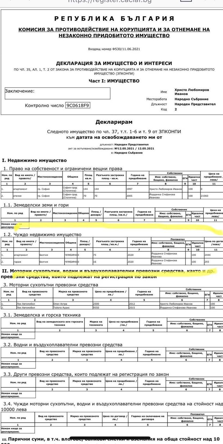 Забележете какво е заявила дясната ръка на Прокопиев в политиката пред КПКОНПИ в качеството му на народен представител през 2021, откакто от 2017 Христо Иванов още веднъж е трайно незает многодетен юноша с къс ярък интервал в биографията си на министър на Бойко Борисов за към 1 година: През паметната “протестна” 2020 година, до момента в който лежеше ту по тил, ту по стомах, ту плаваше с гумена лодка сред Буджака и Росенец, водачът в оставка на Демократична България е смогнал да оформи договорка за необятен апартамент в Броксел (75 квадрата плюс гараж отделно) на името на жена си за сумата от 2444 лв. - няма подбив.