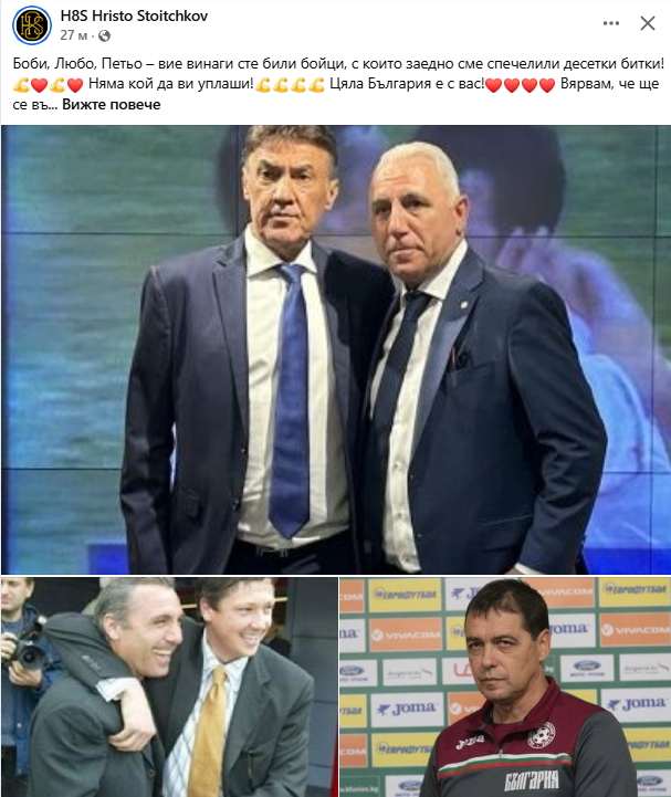 " Боби, Любо, Петьо – вие постоянно сте били бойци, с които дружно сме спечелили десетки борби! Няма кой да ви уплаши! Цяла България е с вас! Вярвам, че ще се върнете по-силни от всеки път! Прегръщам ви! ", написа Стоичков.