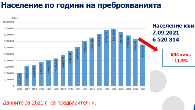 От 7 септември до 10 октомври 2021 година в България се организира 18-то броене на популацията и жилищния фонд в страната.То удостоверява задълбочаването на отрицателните демографски трендове, съществуващи през последните 30 години в страната - понижаване и застаряване на популацията, обезлюдяване на обособени територии на страната в резултат на негативния натурален приръст и миграционните процеси.
