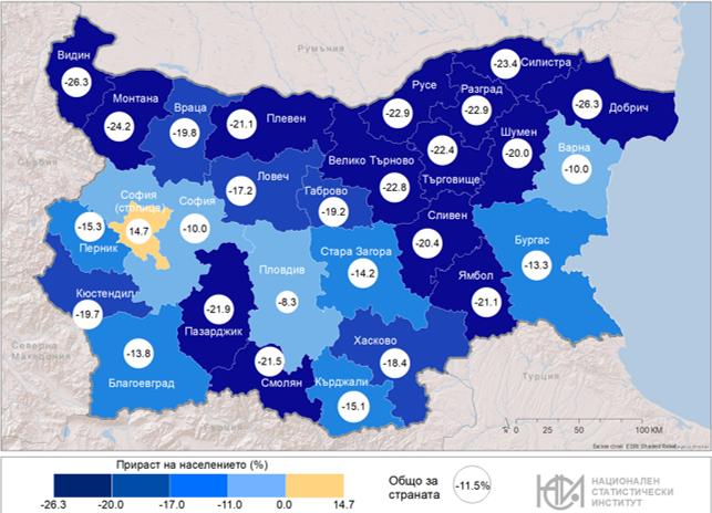 Прираст на нселението към 7 септември 2021 година, по отношение на Преброяване 2011 (Източник: НСИ)