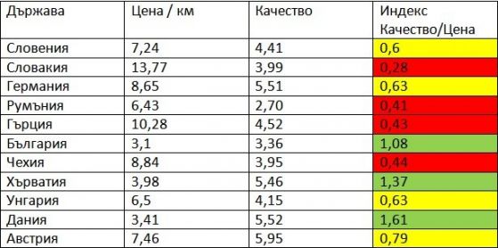 Все отново, България получава по-добро качество за цена от сравними като качество на пътищата и релеф страни като Румъния, Чехия и Словакия. Да, качеството у нас в пътното строителство не е доста високо спрямо много страни в Европейски Съюз, само че и цената е несравнимо по-ниска от тази, която заплащат останалите европейски страни.