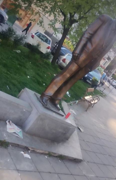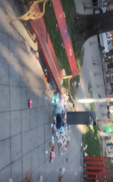 Боклуците се виждат захвърлени край пейките, по постамента на монумента, до кошчетата за боклук и на самата полянка.