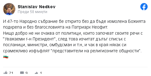 И 47-то Народно заседание беше намерено без да бъде измолена Божията поддръжка и без благословията на Патриарх Неофит. Това написа като коментар за първия ден на новия парламент Станислав Недков-Стъки.