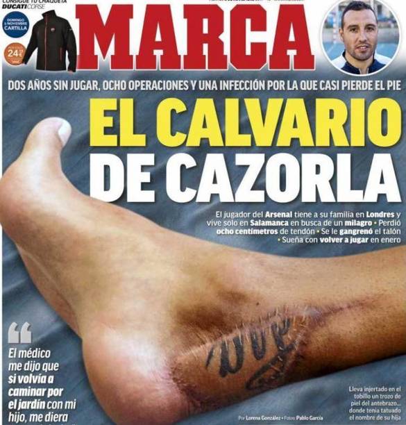 Кошмарът стартира, когато испанският национал претърпя интервенция на сухожилие на дясното стъпало, която се предполагаше да го задържи отвън терените единствено за три седмици. Когато обаче след месец му махнаха конците, раната даже не бе почнала да заздравява. Нещо повече, отваряше се непрекъснато още веднъж и още веднъж, та след минаването през хирургическата маса цели осем пъти за една година, пристигна миг, в който болката и накуцването доведоха до поява на боязън от най-лошото. В репортажа на Лорена Гонсалес и Пабло Гарсиа, Санти не се поколеба да покаже фотография на глезена си с оголеното сухожилие, както и да показа какво са му споделили лекарите.