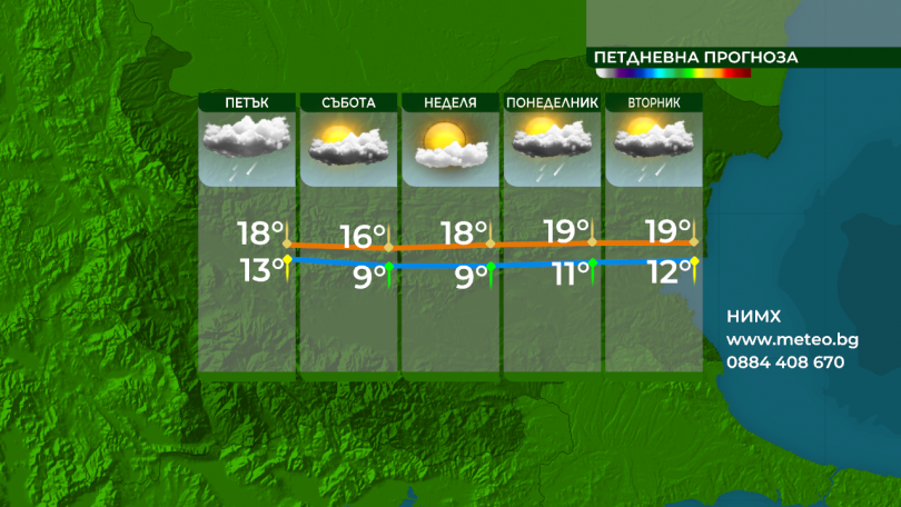 Минималните температури ще бъдат сред 12 и 17 градуса, оптималните – от 25 до 30, в Източна България, където ще духа сдържан югозападен вятър - до 32 градуса. В следобедните часове, със мощен северозападен вятър, в западните региони ще стартира да нахлува по-студен въздух.