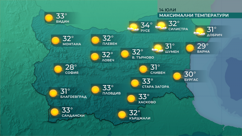 През нощта вятърът ще отслабне и на следващия ден ще е слаб, от северозапад, в Източна България от север-североизток. Ще бъде слънчево. Максималните температури ще се покачат и ще бъдат сред 29° и 34°, в София - към 28°.