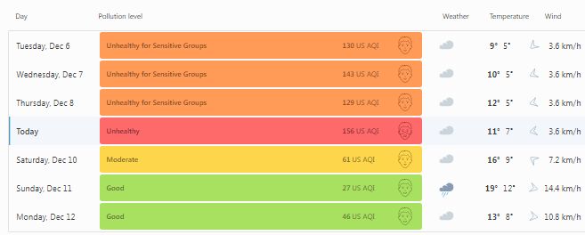 Според портала IqAir, равнищата на фините прахови частици PM са 13,2 пъти по-високи от естествените (за съпоставяне, тези в София през днешния ден са 9,5 пъти по-високи). За да се предпазим от рисковите равнища на замърсяване, те поучават да излизаме на открито с маски, да не отваряме прозорците си, да използваме пречистватели за въздух в домовете си и да не упражняваме на открито.