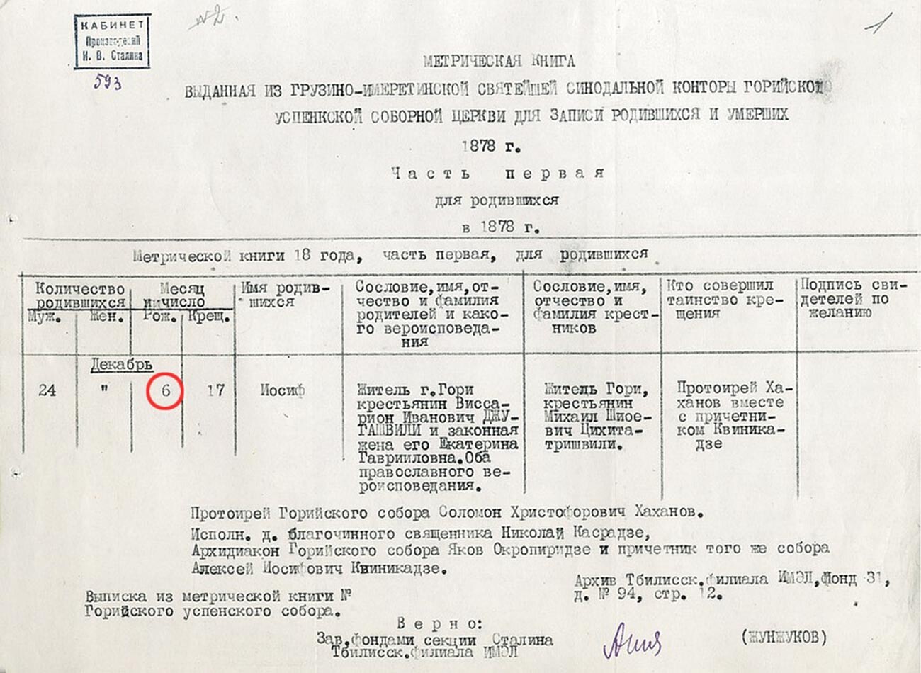 Именно тази дата (6 декември 1878) може да се срещне и в тапия на Йосиф Джугашвили от Горийското духовно учебно заведение, и в уведомленията на Санктпетербургското губернско жандармско ръководство от 1911 година за „ неблагонадеждността на Сталин “. Нещо повече, през 1920 година Сталин самичък попълня анкета на шведския вестник Folkets Dagblad Politiken („ Ежедневен Народен Политически Вестник “), издаван в Стокхолм. Тук рождената година също е 1878-ма.