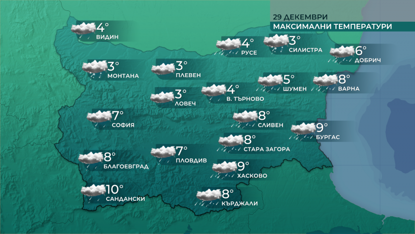 У нас през нощта против четвъртък преваляванията ще продължат, а в четвъртък ще се задържи облачно, тук-там в низините мъгливо. В петък в доста региони облачността краткотрайно ще понижава до слънчево време, а с увеличаване напразно от северозапад ще се затопли, дневните температури ще се покачат с 5-6 градуса. Новата година ще стартира с прохладно и относително топло време.
