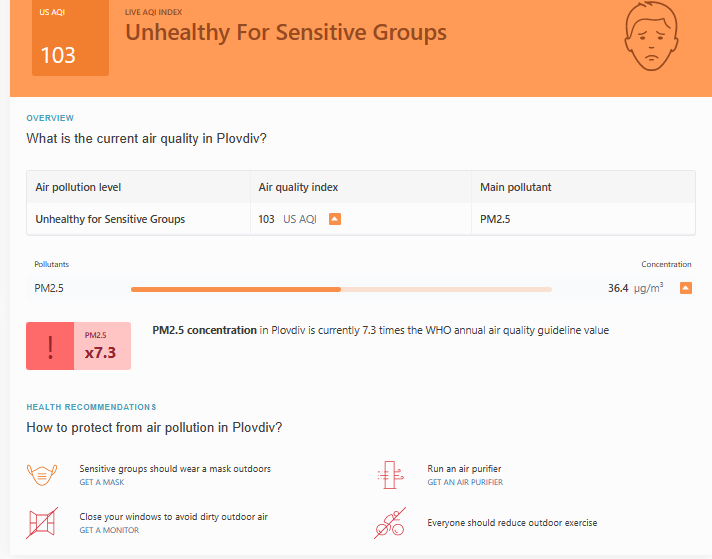 Според портала IqAir, ниват на фините прахови частици PM 2.5 са 7,3 пъти повече от нормата. Световната платформа сигнализира, че при сходни равнища хората не би трябвало да спортуват на открито, би трябвало да затварят прозорците си, да пускат пречиствател за въздух в домовете си, а в случай че им се наложи да излизат - да носят маска.