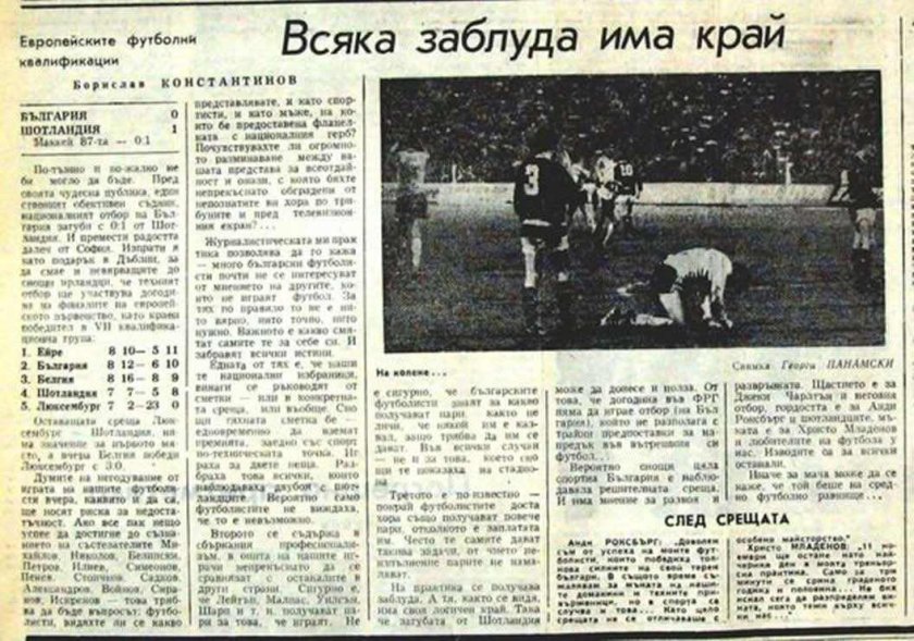 Двубоят клони към нулево тъждество, което изцяло устройва България, само че в 87-ата минута дебютиращият Гари Макай - футболистът на Хартс, който в този момент е водач в Шотландия, се появява като запаса през втората част и... попарва нашите очаквания - 0:1, а за финалите се класира Ирландия на Джеки Чарлтън, когато папата по това време наричаше Шефа, само че за почитателите той постоянно си беше Жирафа.