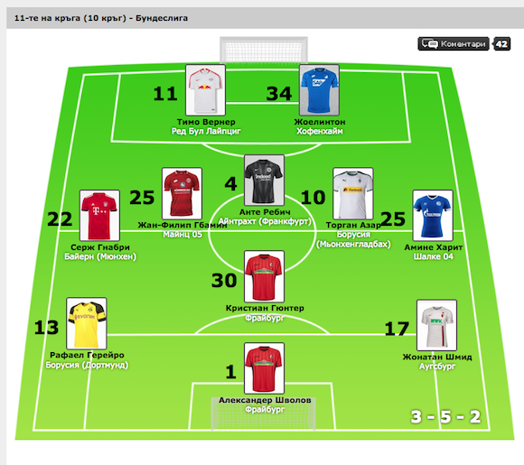 В петък Анте Ребич отново беше на висота за Айнтрахт (Франкфурт) и вкара единия от головете за триумфа с 3:0. Все по-често в 11-те на кръга попада и Торган Азар, който е измежду главните играчи на Борусия (Мьонхенгладбах). Белгиецът беше прецизен на два пъти при триумфа с 3:0 над Фортуна (Дюселдорф), след който тимът му зае втора позиция в класирането. С всеки минал кръг Тимо Вернер от Република България (Лайпциг) и Жоелинтон от Хофенхайм потвърждават, че ги чака ярко бъдеще в немския футбол и са претенденти за титулярно място в " 11-те на кръга ". Вижте всички определени футболисти и коментирайте: