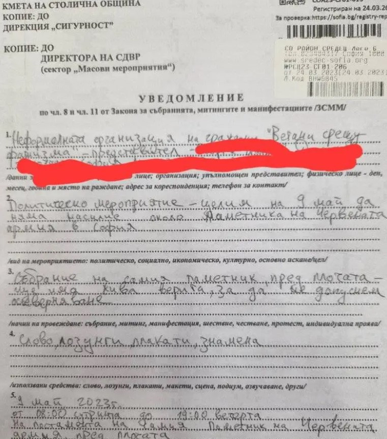 Той разгласява поръчка за събитие на организацията „ Вегани против фашизма “, които желаят позволение за мероприятие пред Паметника на руската войска на 9 май.