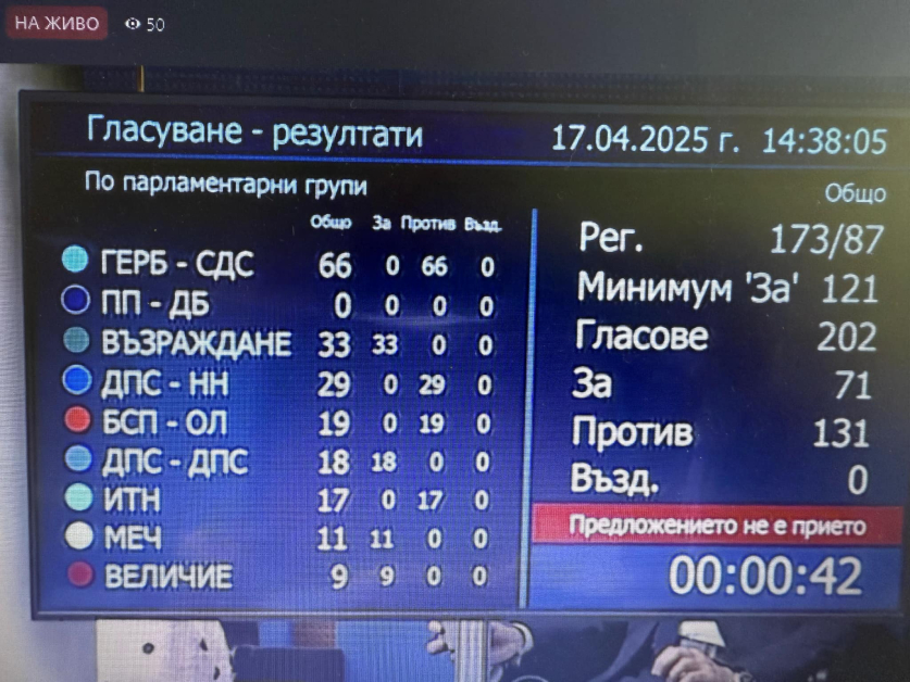 130 депутати гласоподаваха срещу свалянето на държавното управление, а 70 - за. Въздържали се нямаше.