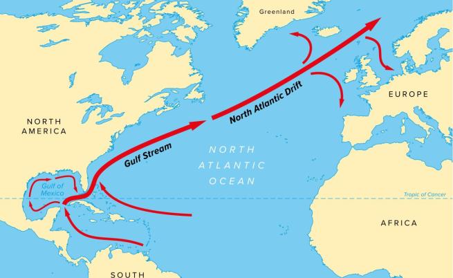 Мощното течение в Атлантическия океан има функционалност да придвижва топли водни маси на север към Нормандските острови, Ирландия, Англия и по-нататък към Нидерландия, Германия и Скандинавия, като по този метод поддържа умерения условия за контролиране на морското ниво .
