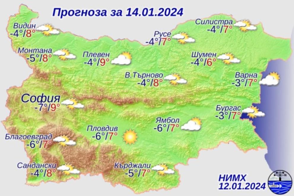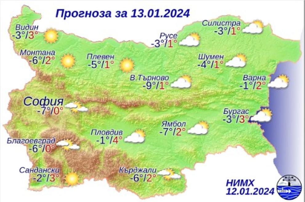 Преобладаващите минимални температури ще са сред минус 7° и минус 2°, в София – към минус 7°. Събота времето ще е най-вече слънчево .