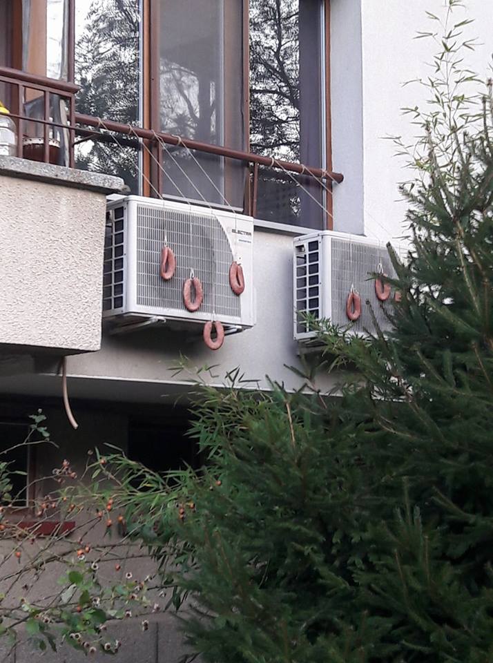 Находчив софиянец от столичния квартал Гоце Делчев е навъртял хубави суджуци, които е закачил да висят към климатика на балкона си.