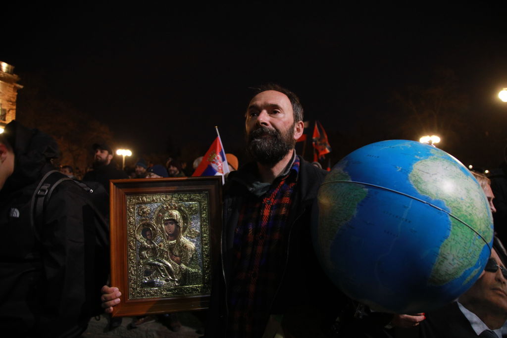 Икона на света Богородица в едната ръка и... училищен глобус в другата. Това са символните атрибути, с които един от участниците в проруската проява в Белград излиза на улицата.