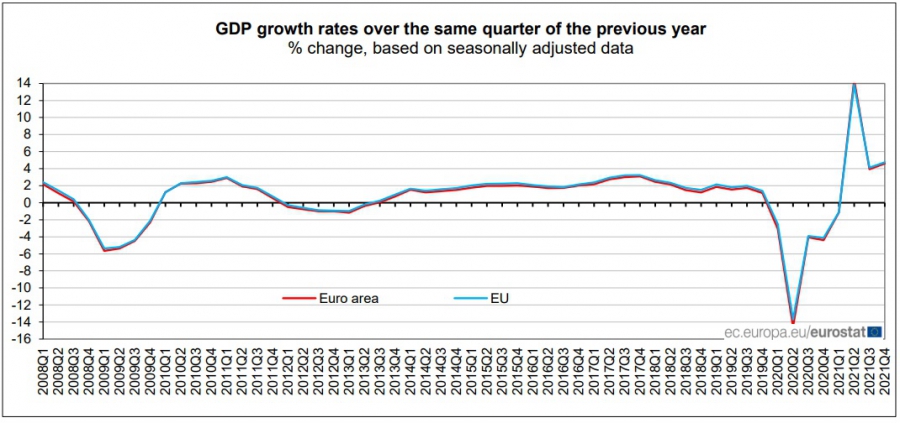 Годишният напредък на Брутният вътрешен продукт съответно за четвъртото тримесечие възлиза на 4.8% за Европейски Съюз и 4.6% за страните от еврозоната. Това е ускоряване на растежа, откакто през третото тримесечие бе регистрирано годишно повишаване с 4.1% за Европейски Съюз и растеж от 3.9% за членките на еврозоната.