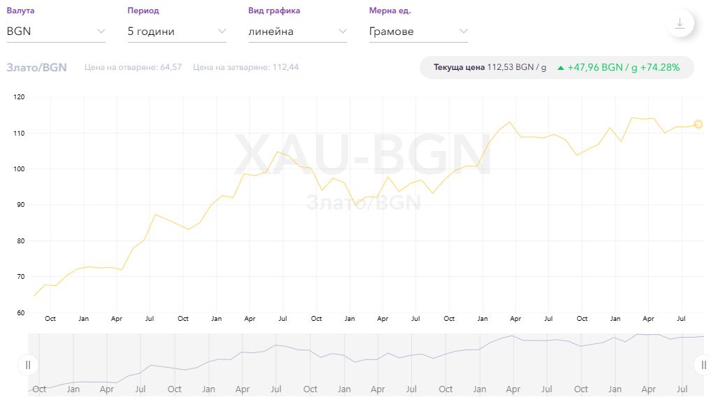 Точно преди 5 години грамът капиталово злато у нас се е търгувал за 64,5 лв.. Днес цената му е с 74% по-висока - 112,50 лв. за грам. Така, в случай че прогнозите се оправдаят, повишаването на скъпия метал през идващите 5 години може да бъде сред 50-60%.